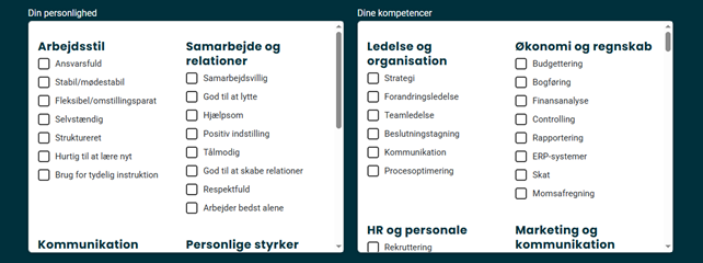 Det er vigtigt at du krydser alle de felter af som du kan relatere til – både under personlighed og kompetencer.