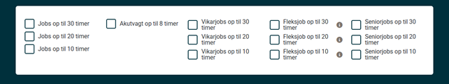 Når du vælger din jobtype og timeantal skal du være opmærksom på at, hvis du vælger fleksjob, er det et krav at du allerede er visiteret til fleksjob.