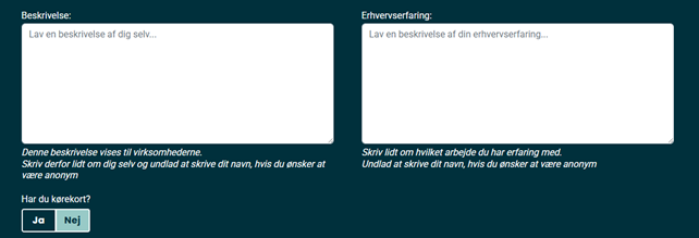 I disse felter har du mulighed for at beskrive dig selv, dine erfaringer og færdigheder i detaljer.